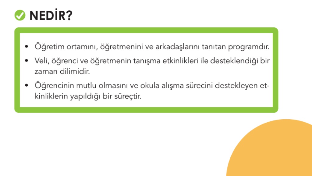 Çocuğunuz henüz okuma yazma bilmese de onları kitaplarla tanıştırın. Ulaşabildiğiniz bir kütüphaneye birlikte gidin ve çocuğunuzun ilgisini çe keceğini düşündüğünüz kitapları birlikte inceleyip onlar hakkında konu şun. Kitaplar çocuğunuzun okul hayatı boyunca hep en önemli eğitim destekçisi olacaktır. Çocuğunuzun kitaplarla olumlu ilişki kurmasını des tekleyin. • Çocuğunuz kendini her zamankinden daha yorgun hissedebilir. Okulda tanıştığı arkadaşları ile pek çok yeni oyunlar oynayacaktır. Bu durumu, çocuğunuzun uyku saatlerini düzenlerken göz önünde bulundurun. • Öğretmenin izin verdiği zamanlarda ailelerin sınıfta bulunabileceğini ço cuğunuza hatırlatın.